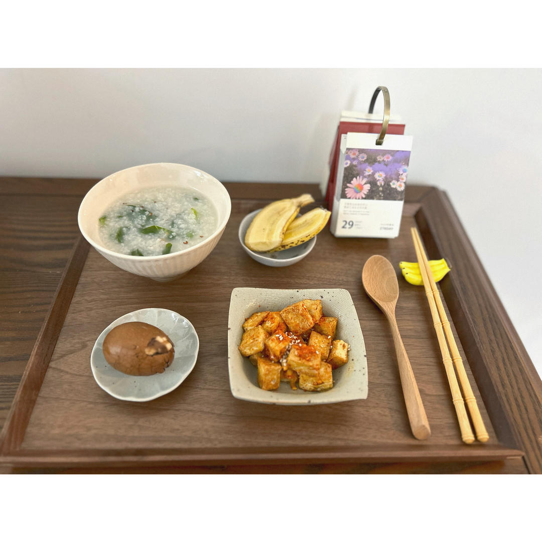 干贝菜粥、香煎豆腐颗、茶叶蛋、香蕉