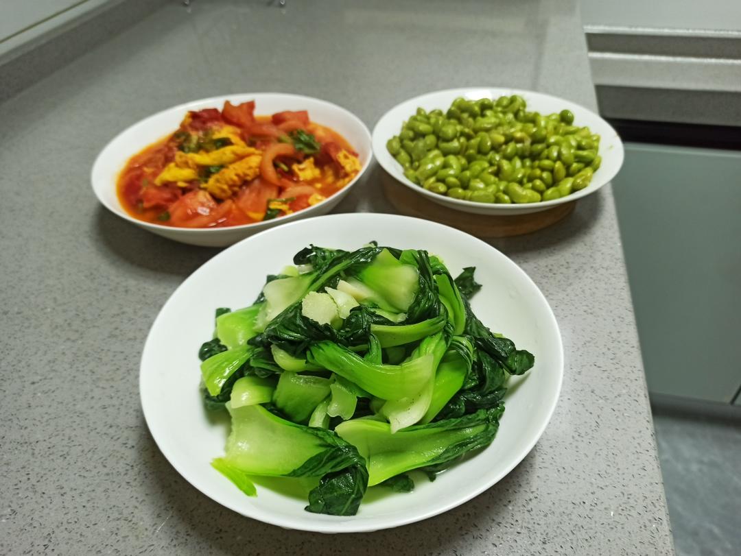 蒜片青菜 西红柿炒鸡蛋 蒸毛豆 和我可姐拍的绿豆粥