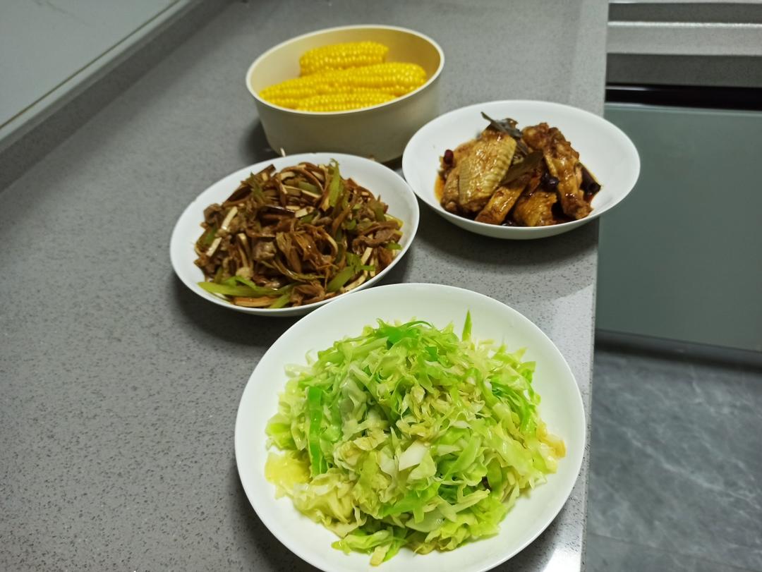 焯包菜丝 肉丝豆干芹菜炒黄花菜 蒸玉米 焖鸡翅