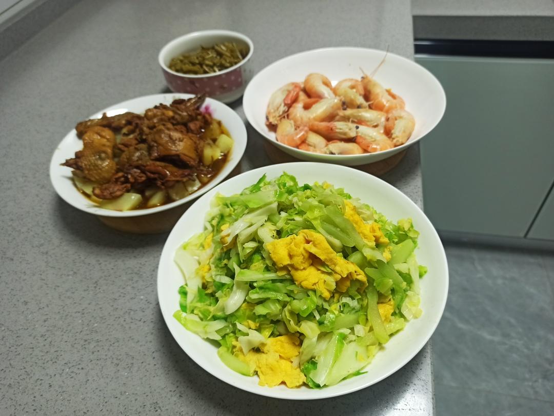 包菜丝炒鸡蛋 鸡块蒸土豆 咸豆角 水煮虾