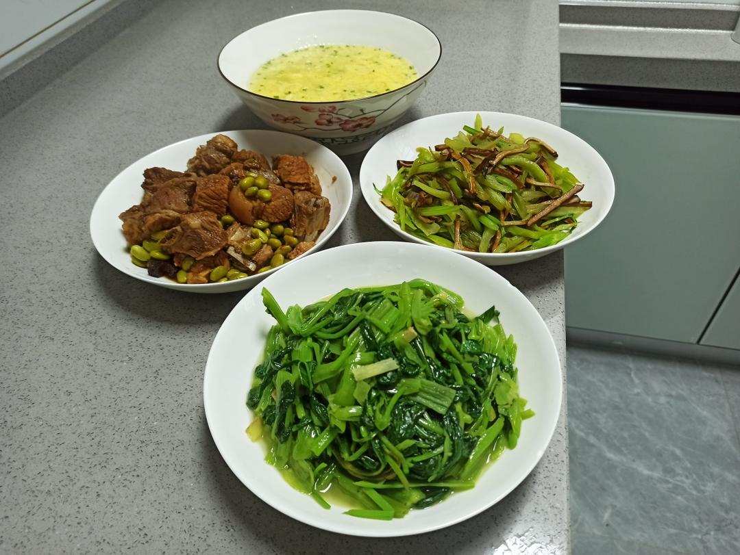 空心菜 排骨毛豆 土豆鸡蛋汤 芹菜青椒炒干丝