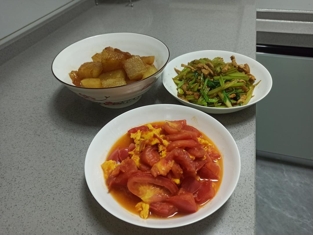 西红柿炒鸡蛋 烧冬瓜 肉丝炒芹菜 和未入镜的蒸毛豆