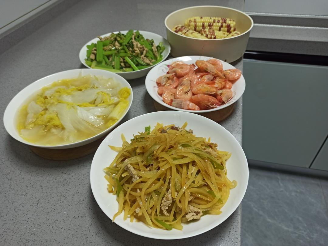 土豆丝 蒸娃娃菜 芹菜炒肉丝 蒸玉米 虾