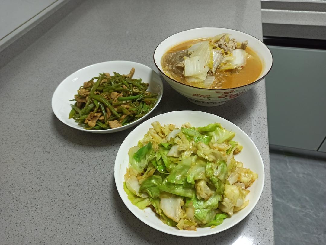 酱油手撕包菜 肉丝炒刀豆 肉片娃娃菜粉丝