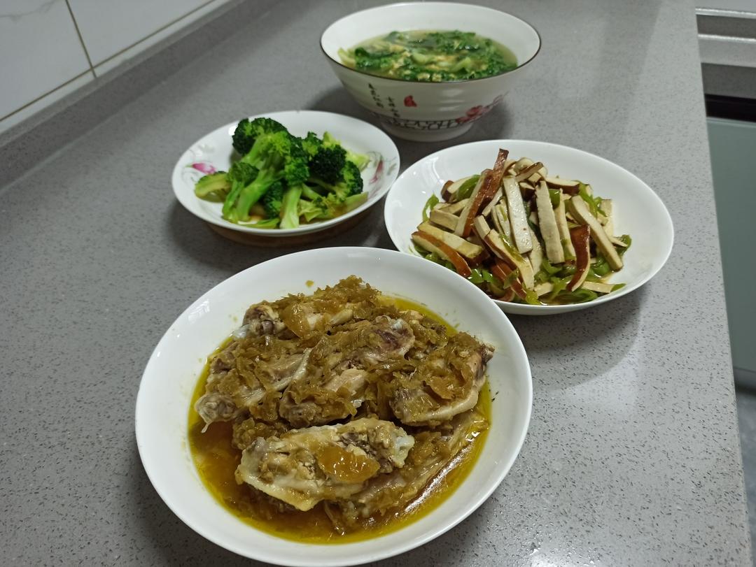 剁椒蒸鸡翅 焯拌西兰花 青菜蛋花汤 青椒炒豆干 和未入镜的蒸毛豆