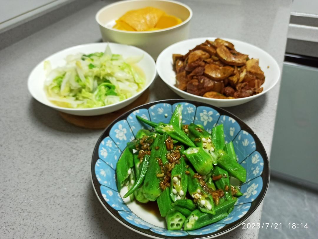 凉拌秋葵 炒洋白菜 蒸南瓜 五花肉烧素鸡