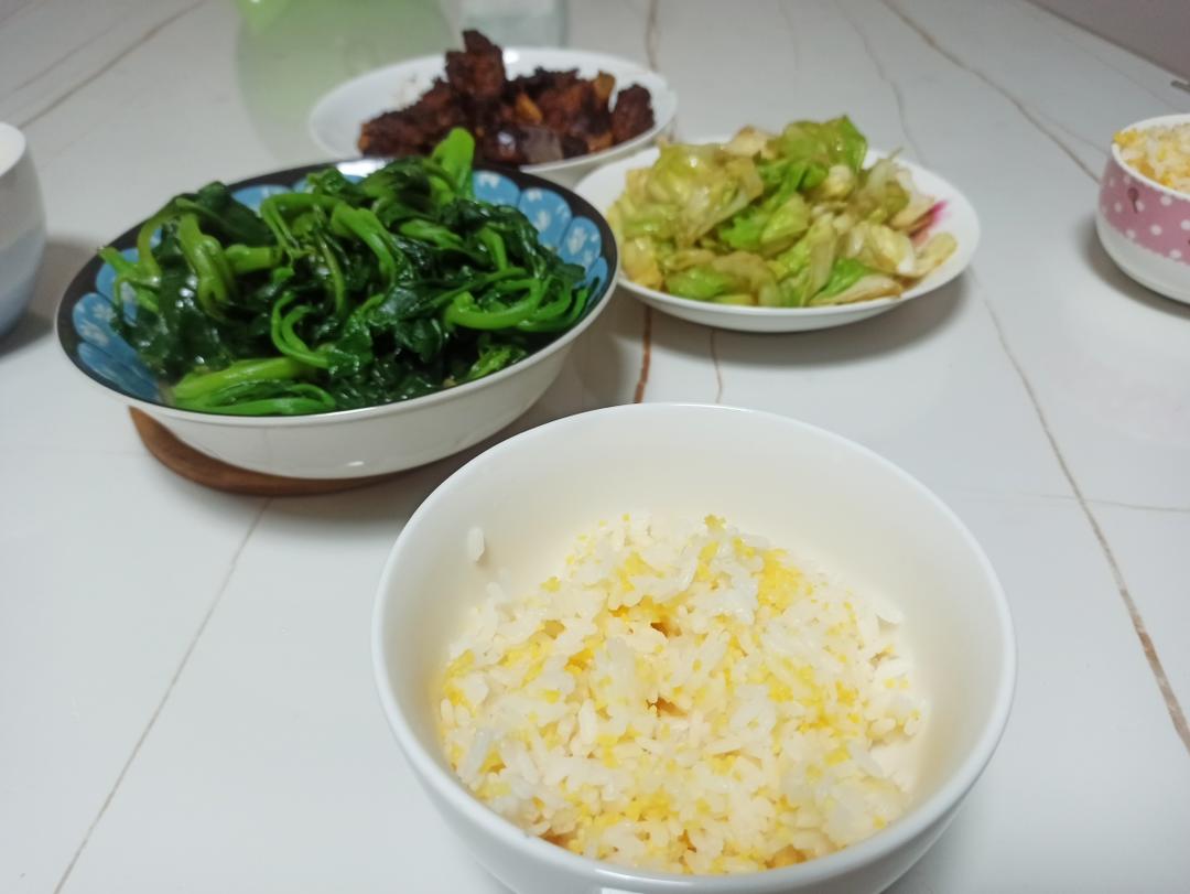 炒韭菜苔 洋白菜 加两份剩菜 可爸吃的剩饭,我和娃娃是大米绿豆粥