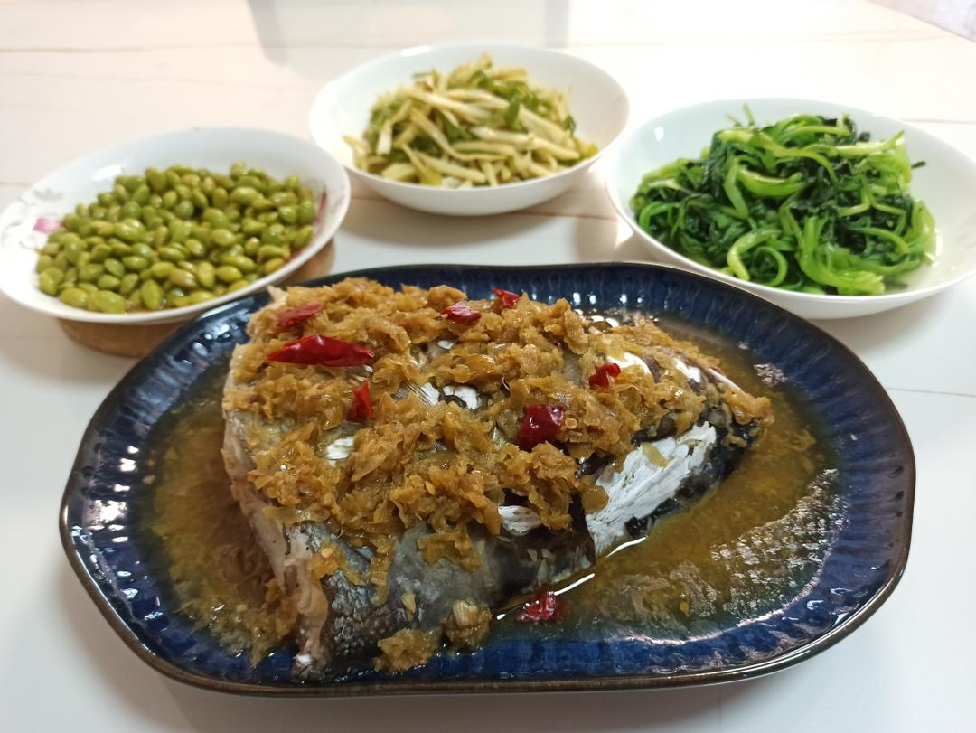剁椒鱼头 蒸毛豆 青椒茭白丝 炒鸡毛菜