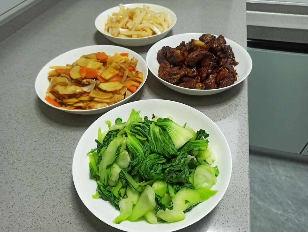 水油焖油菜 胡萝卜土豆炒玉木耳 凉拌粉 红烧排骨
