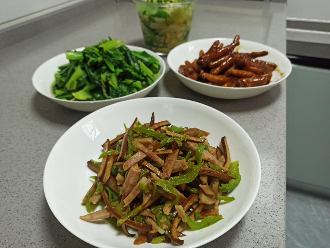 青椒红肠炒干丝 水油焖油麦菜 蘑菇青菜鸡蛋汤 焖鸡爪 水果玉米