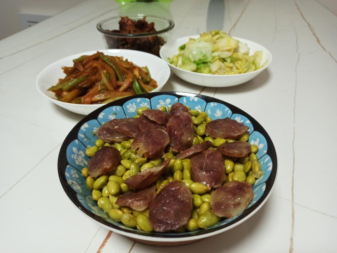 香肠蒸毛豆 蒜子菜瓜 预留的红烧鸡 手撕包菜