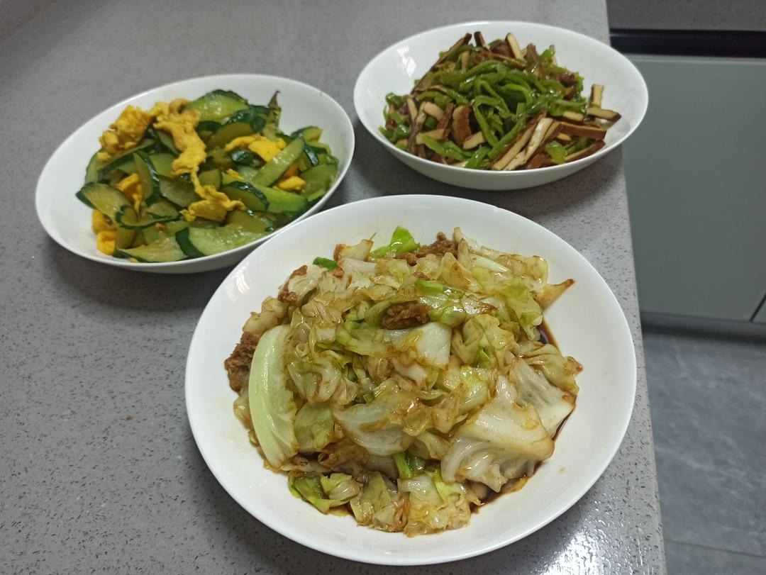 酱油手撕包菜 黄瓜炒鸡蛋 青椒炒干丝 海带排骨汤