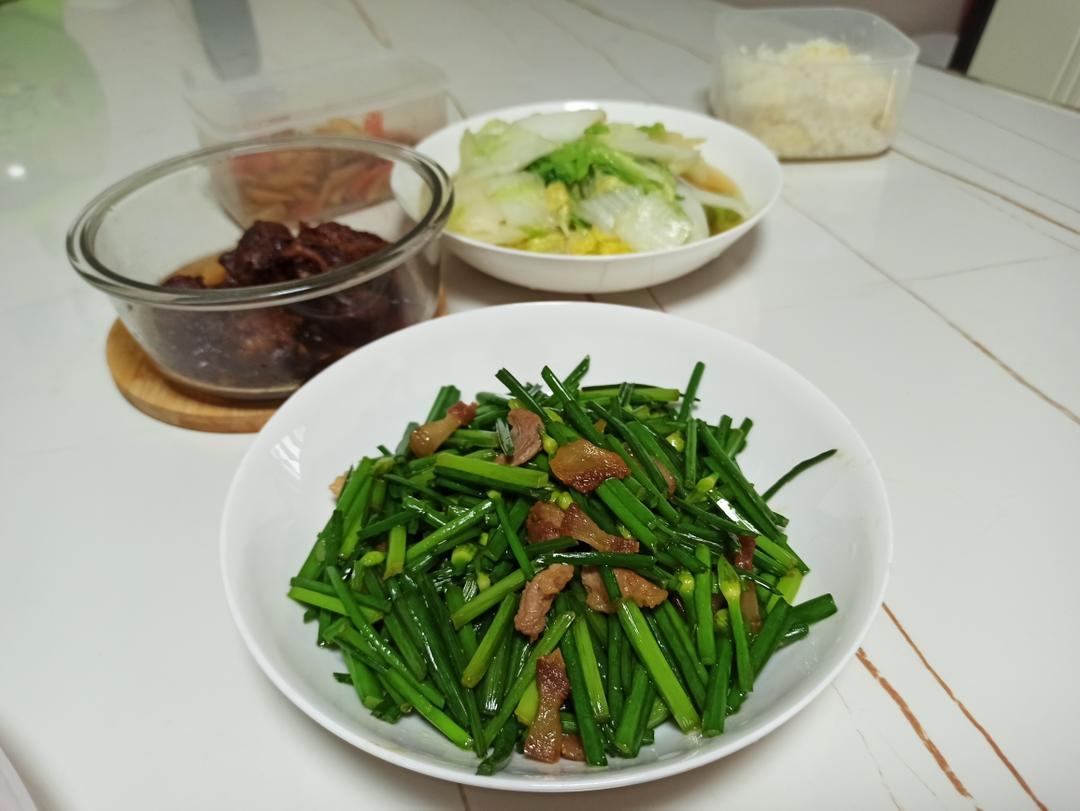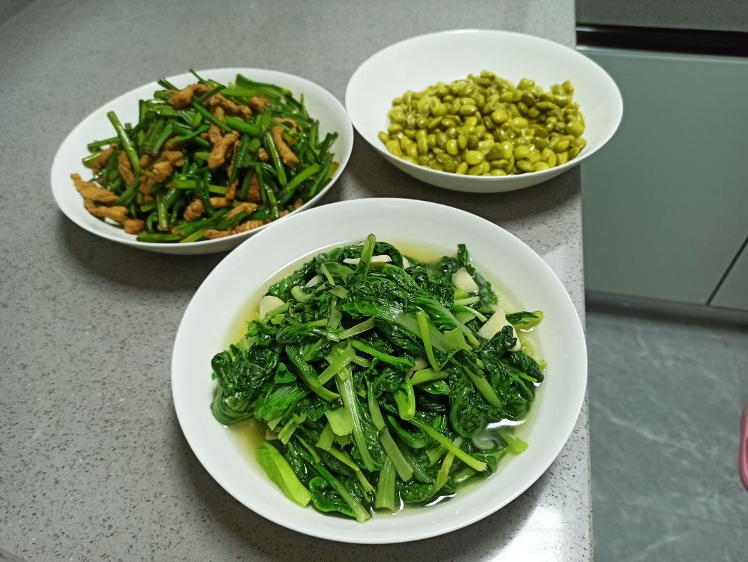 蒜片青菜 肉丝炒韭菜苔 蒸毛豆