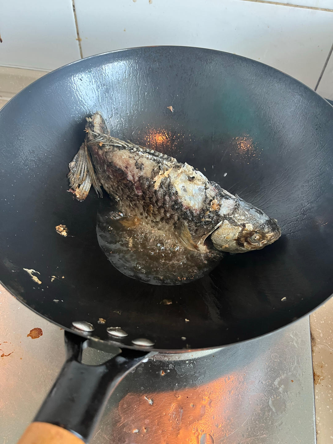 热锅凉油,葱姜蒜花椒八角出味后,放鱼炒时间长一点,加开水