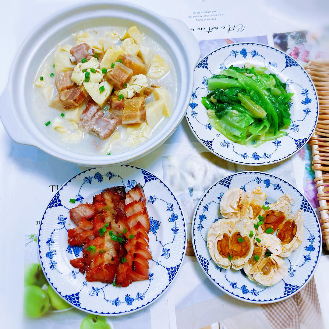 腌笃鲜、蜜汁叉烧、咸蛋、蒜蓉生菜
