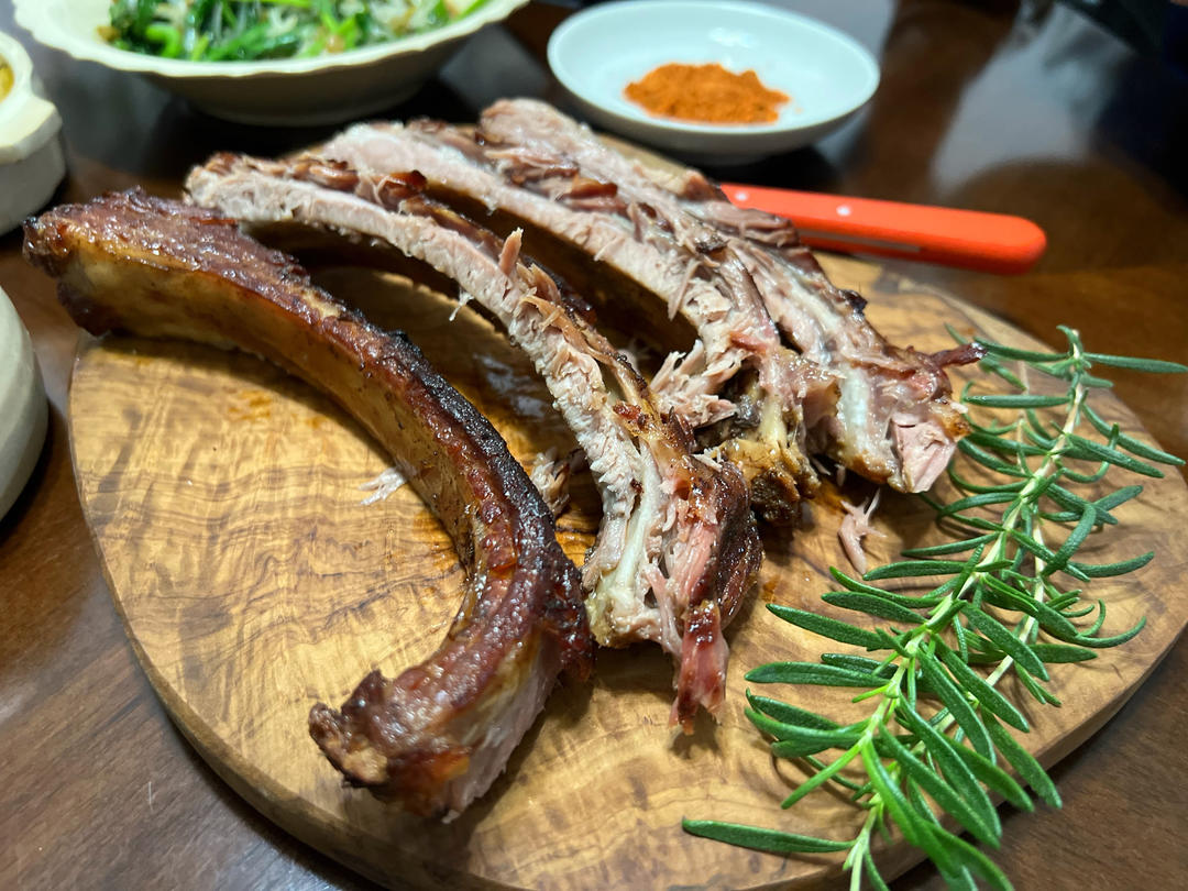 🥓🥩烤肋排、酸豆角韭菜炒豆芽、橄榄油迷迭香焖煎土豆、芒果。今晚的每一样菜都是绝绝子🥹