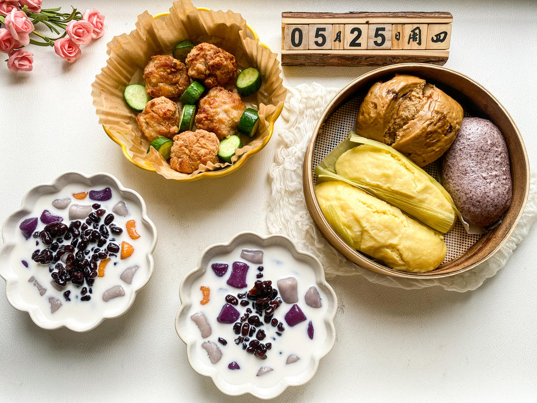 牛奶芋圆,黄瓜鸡块,一锅蒸的红糖馒头、紫薯馒头和玉米馍馍