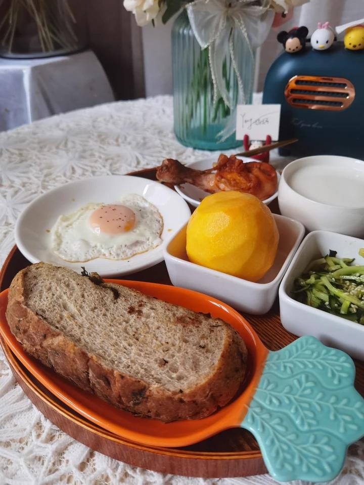 早餐:欧包,烤鸡腿,煎蛋,麻油拌黄瓜丝,牛奶,黄桃
