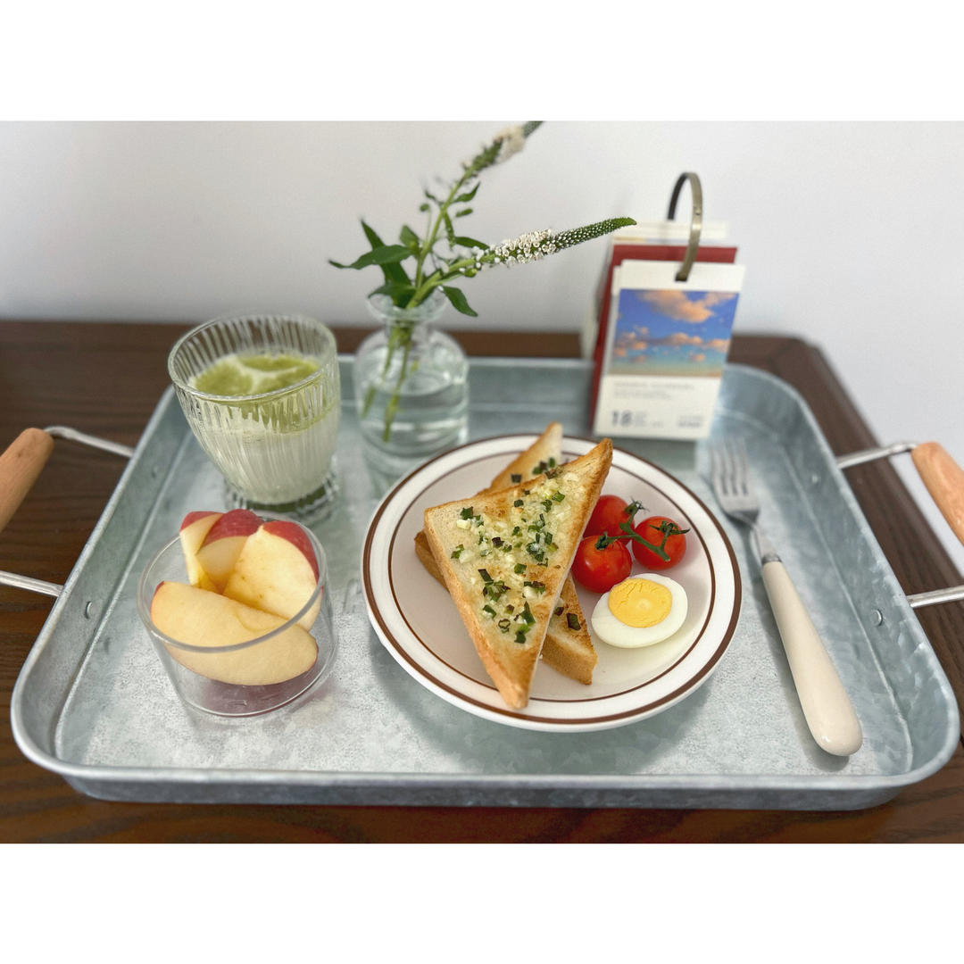 蒜香吐司、抹茶拿铁、苹果