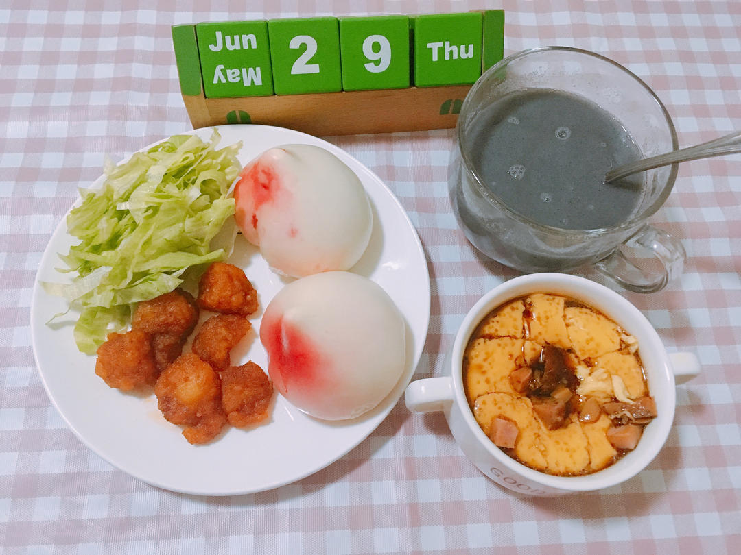 ㏥㏼放假第2️⃣天 寿桃包加火腿蛋羹及鳕鱼丁搭生菜丝配黑芝麻糊