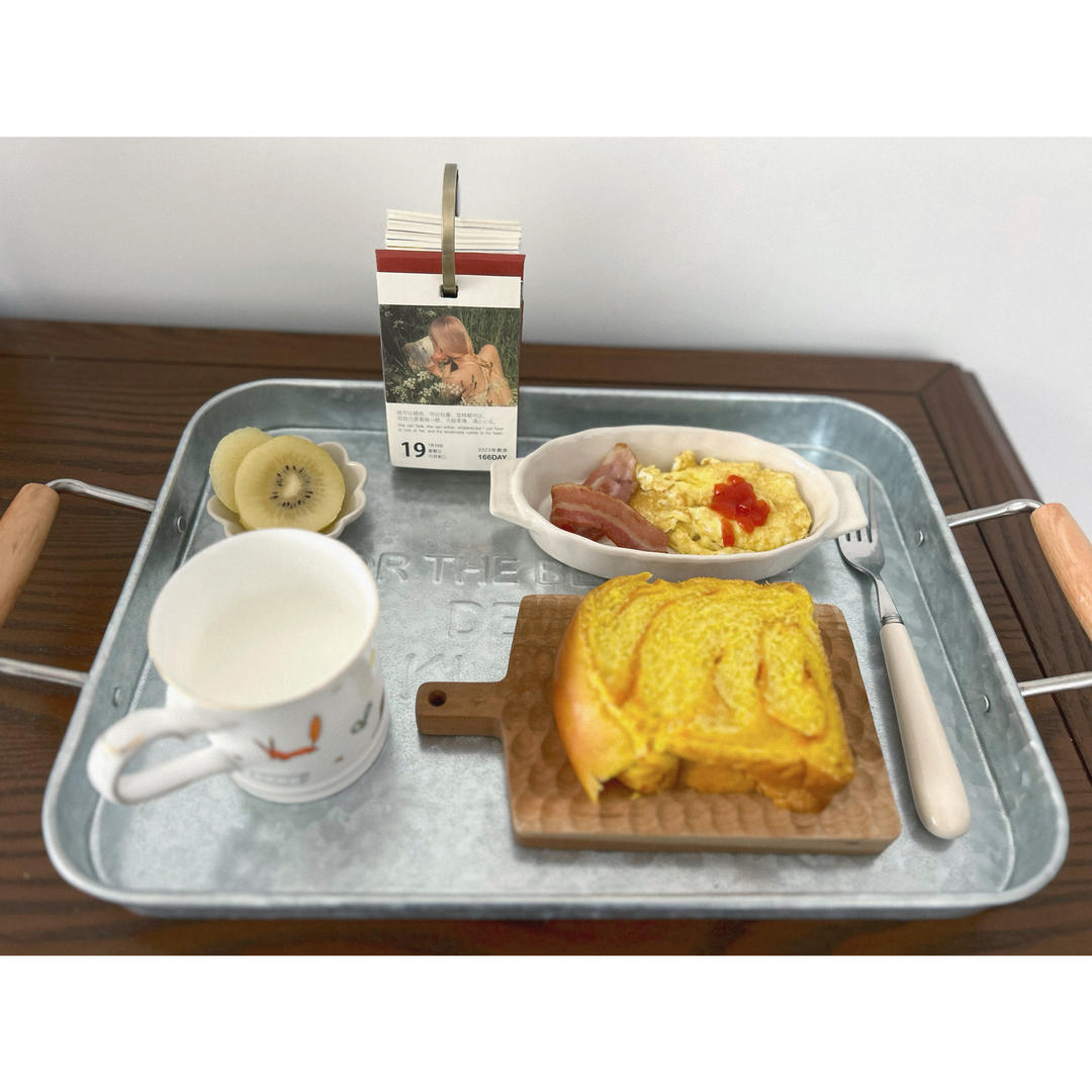 南瓜吐司、鸡蛋培根、猕猴桃、牛奶