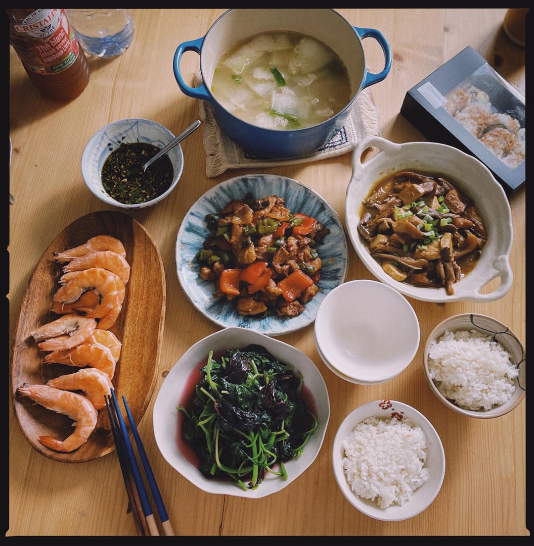 冬瓜瑶柱虾米汤+豆腐烧平菇