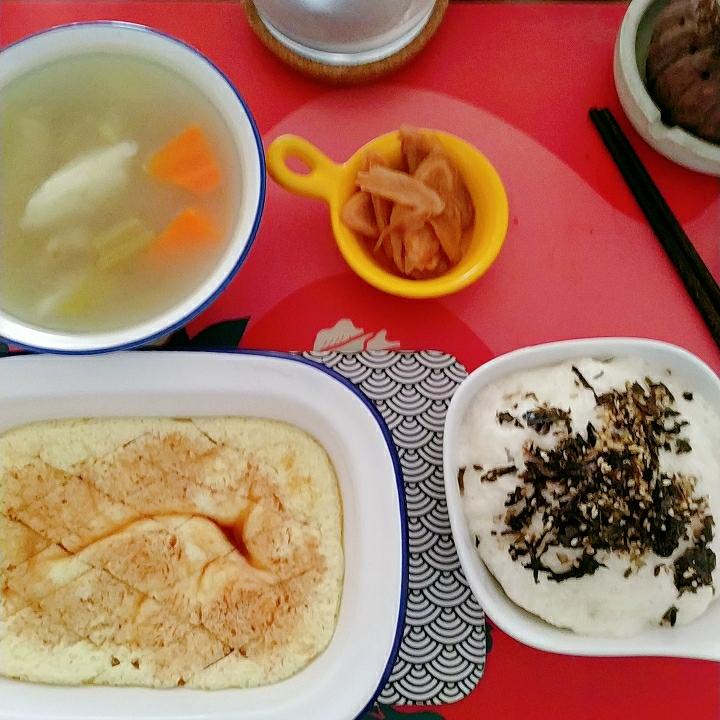 今日份早午饭 蔬菜汤,山药泥拌饭,醋泡姜,鸡蛋羹 八月的最后一天。提醒自己一定要好好吃饭...