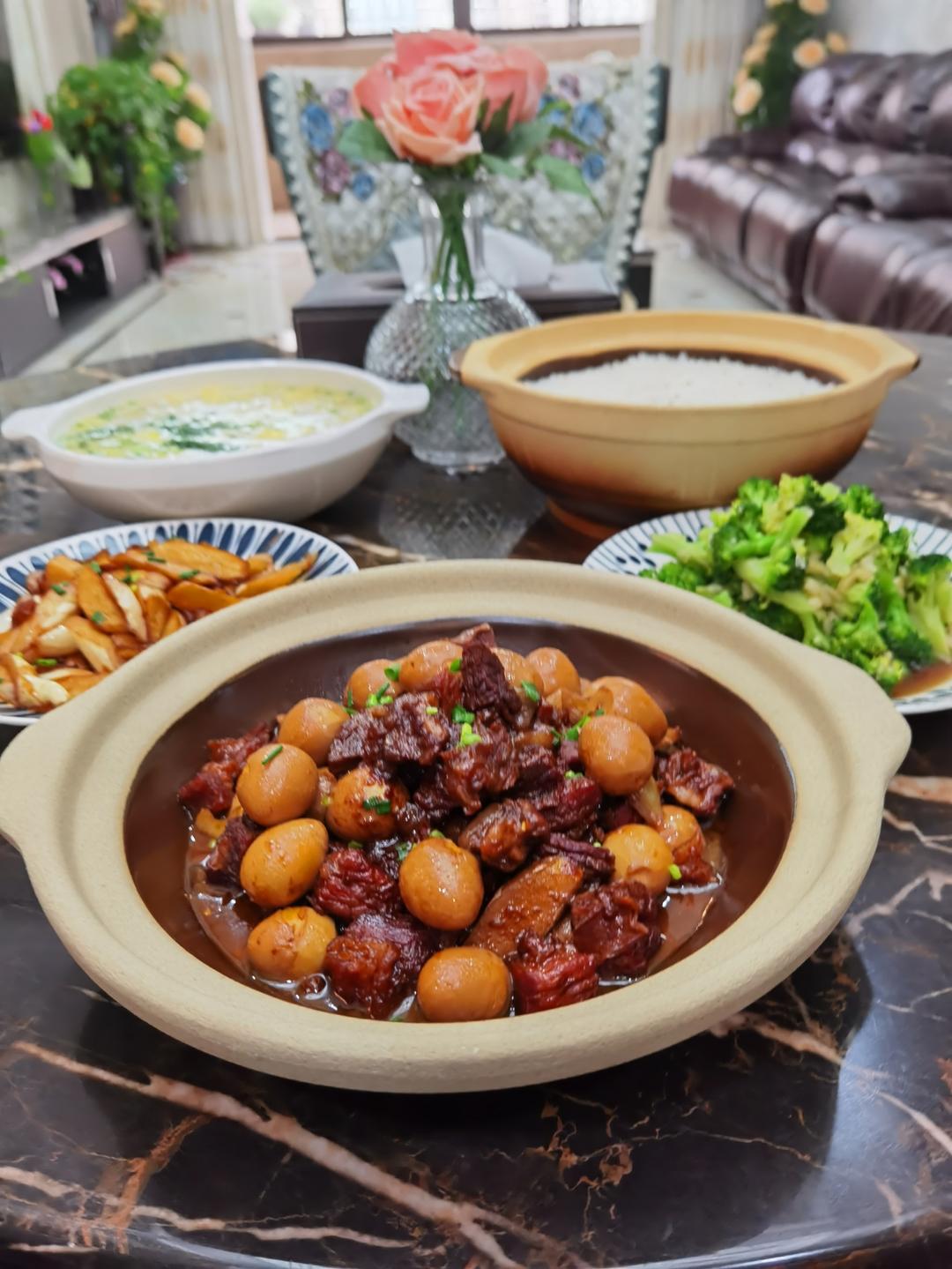牛肉烧鹌鹑蛋,油焖茭白,蒜米西兰花,汆肉蔬菜蛋汤,藜麦米饭