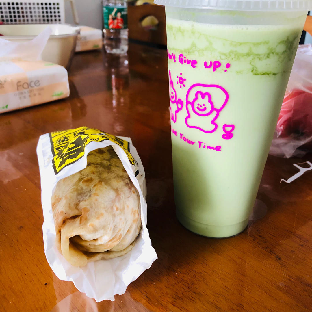 燕麦奶抹茶拿铁。烤肠卷饼
