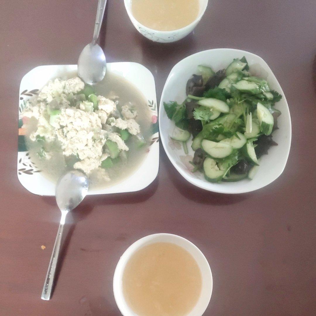 丝瓜炒鸡蛋,拍黄瓜,玉米粥