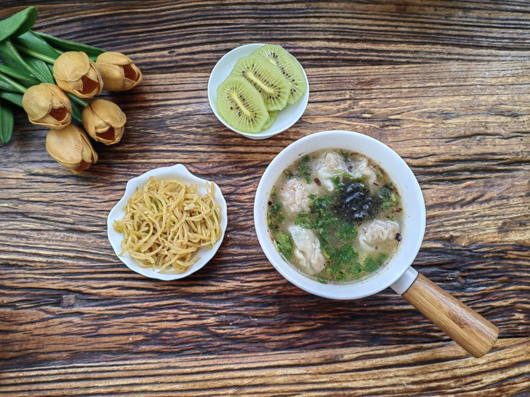 馄饨汤🥣+炒胡萝卜丝🥕+猕猴桃🥝