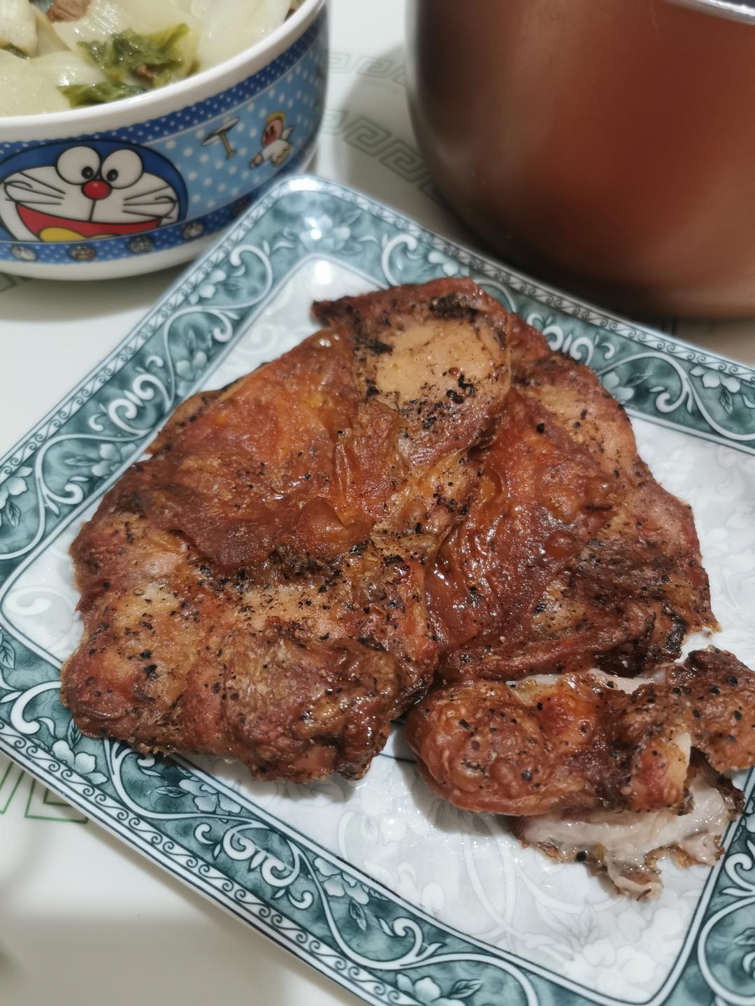 盒马的黑胡椒鸡排,空气炸锅200℃15分钟,好像炸过头了。。。。。