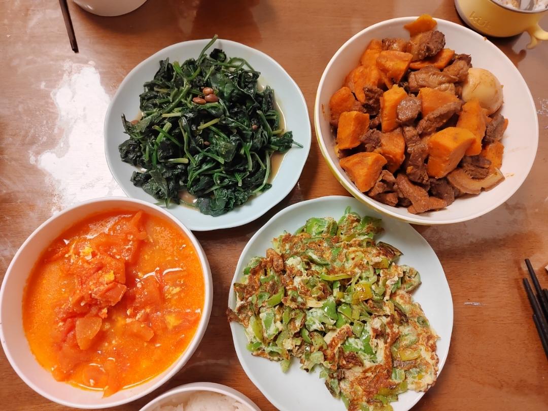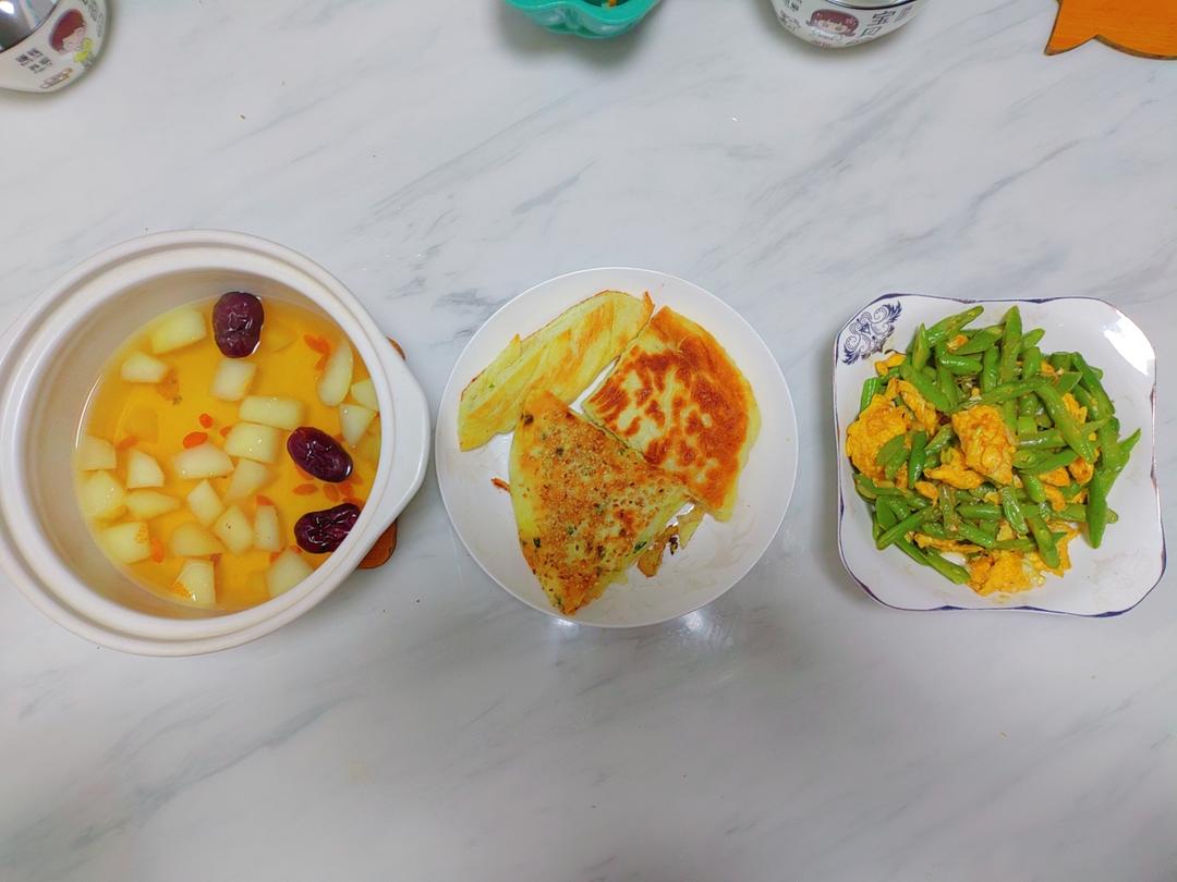 糖醋豆角炒鸡蛋,冰糖雪梨,葱花发面饼。