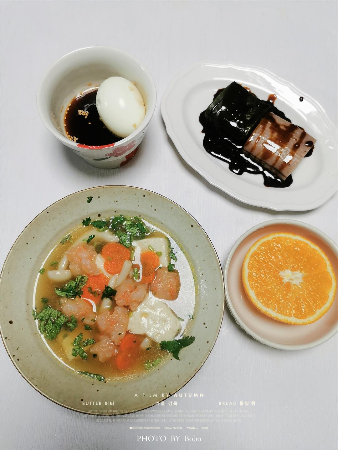 >小学生早餐:虾滑豆腐菌菇汤、红糖年糕、白煮蛋、橙子🍊…