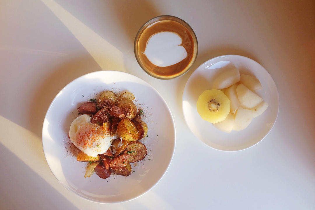 香肠土豆温色拉配温泉蛋&金果&秋月梨&拿铁