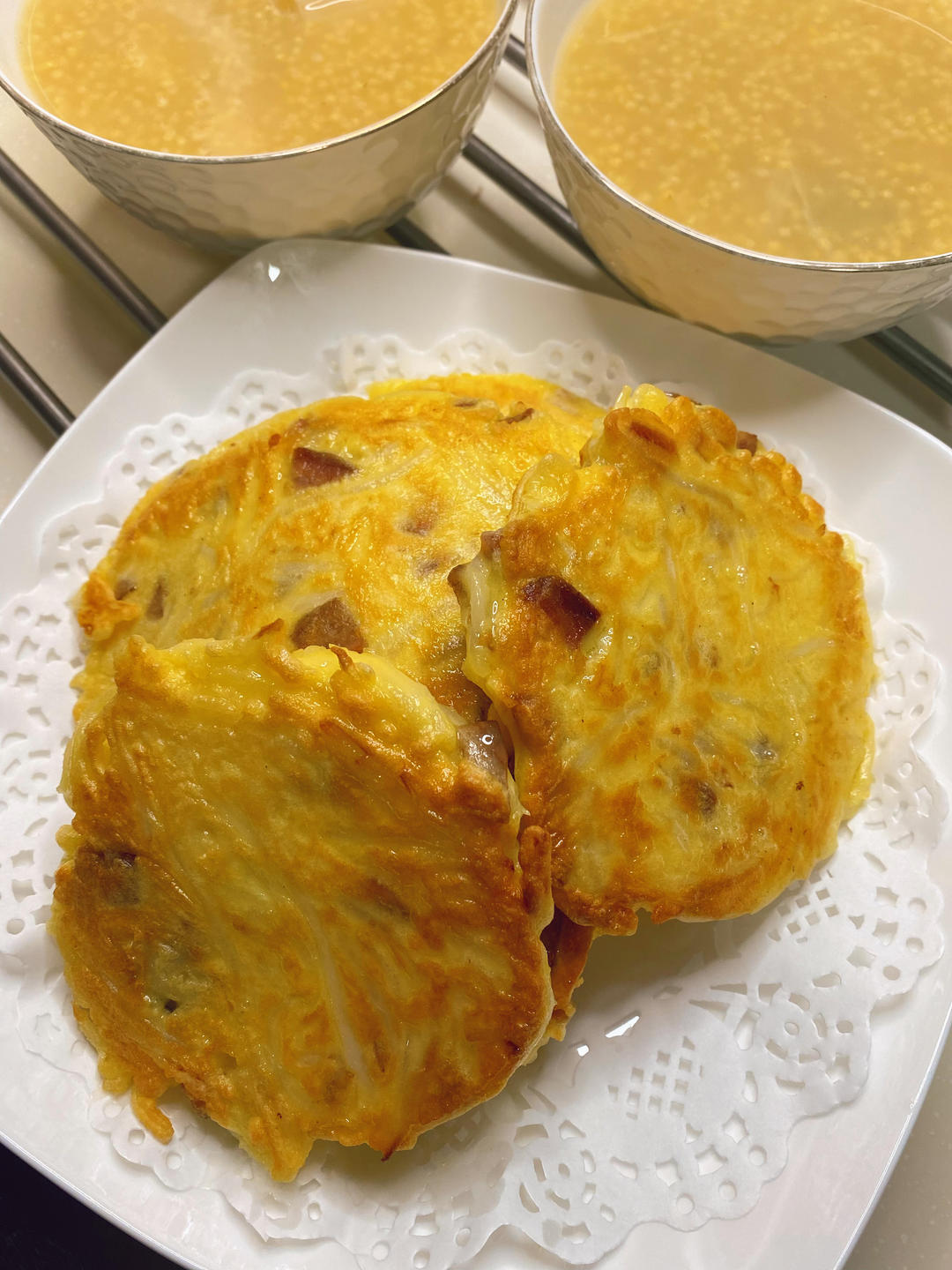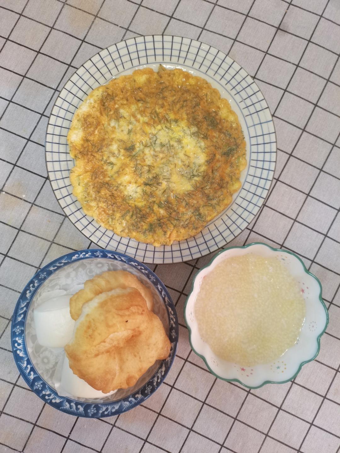 小米粥,茴香煎鸡蛋,油饼,馒头