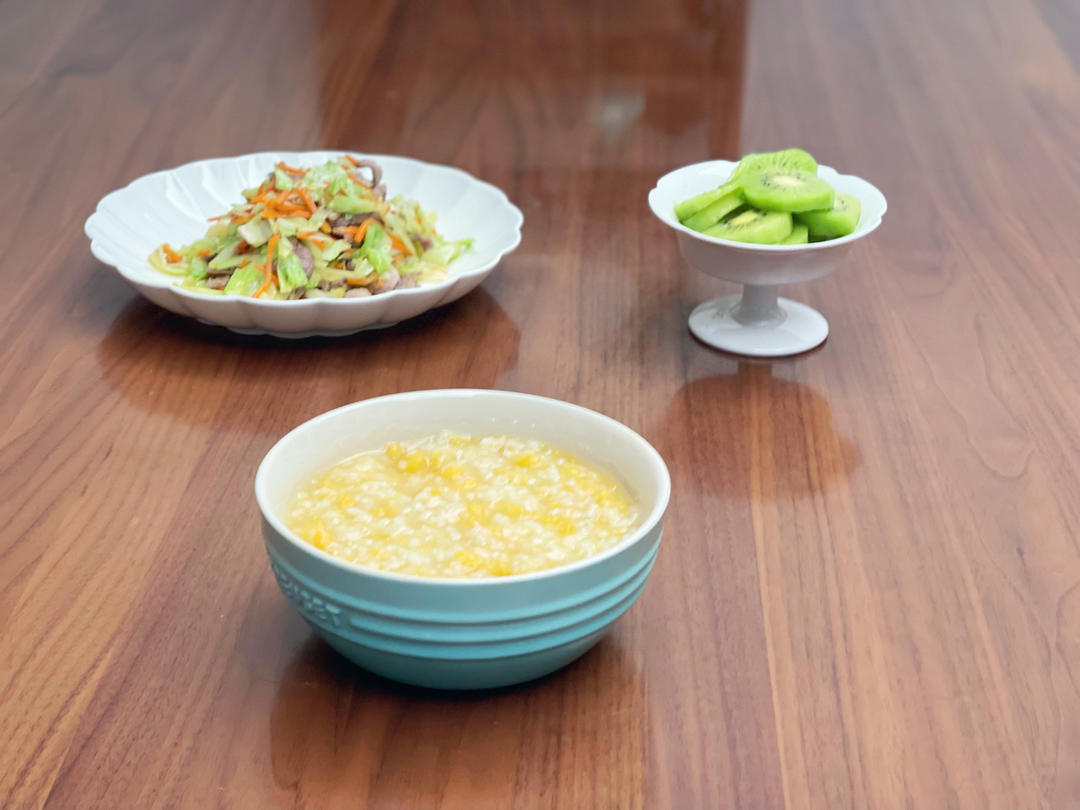 番薯粥、肉丝炒椰菜、猕猴桃