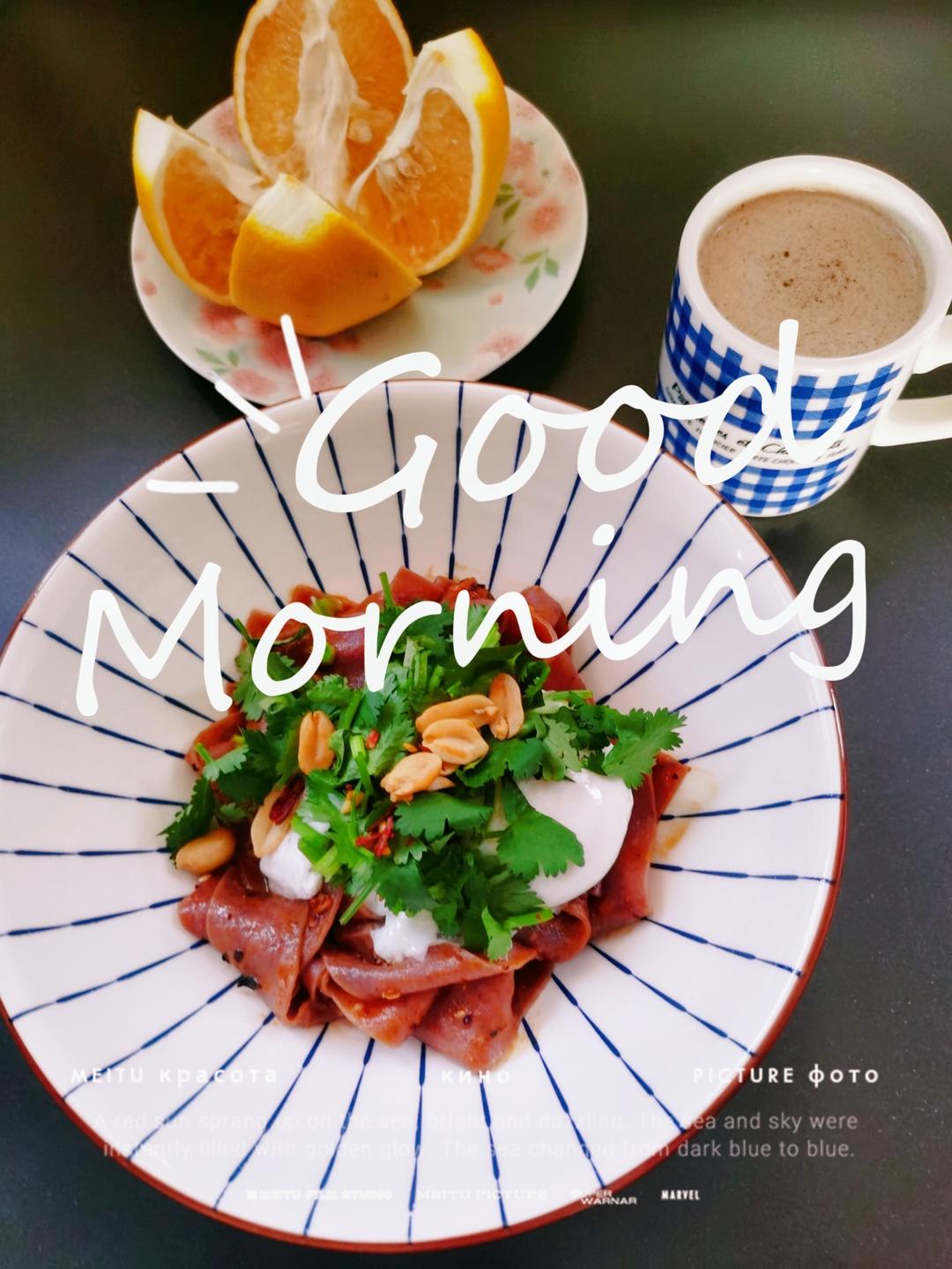 红油麻酱香菜拌紫薯面皮&水波蛋&咖啡&葡萄柚。最近病毒...