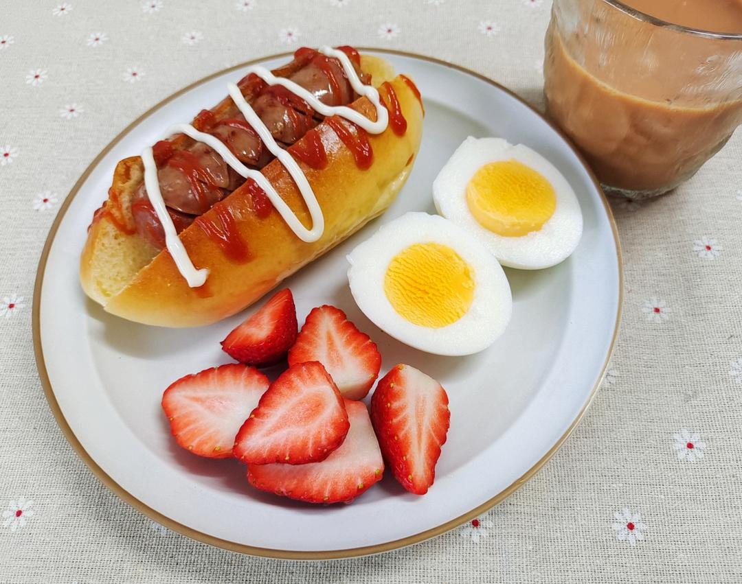 热狗面包+水煮蛋+草莓+奶茶