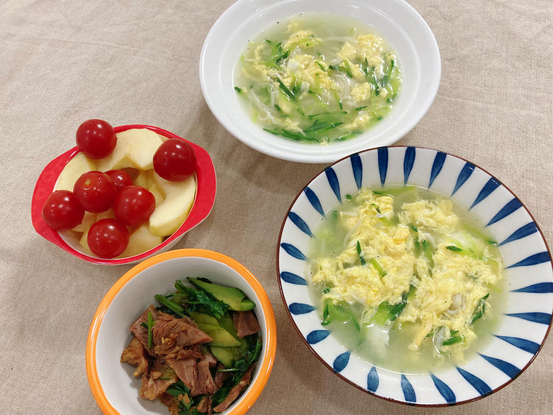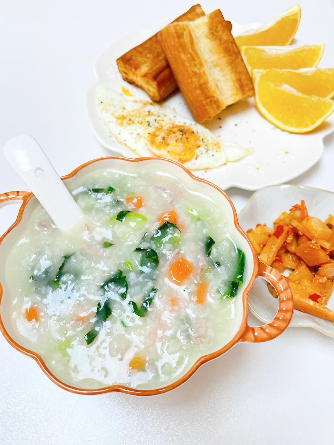 青菜瘦肉粥🥬煎蛋🍳油条🥖橙子🍊泡萝卜