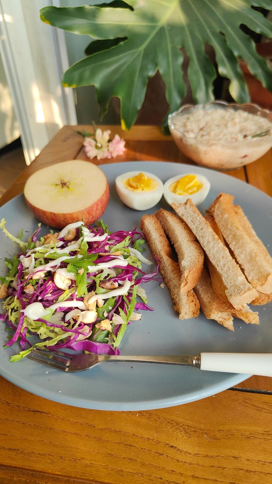 牛奶燕麦+坚果蔬菜沙拉+烤吐司条+水煮蛋+丑苹果