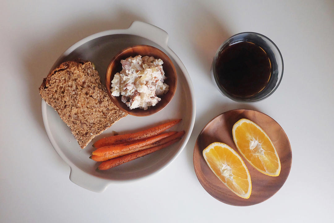 培根洋葱芝士抹酱&七谷杂粮吐司&煎胡萝卜&橙子&手冲咖...