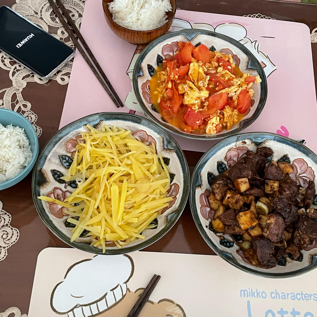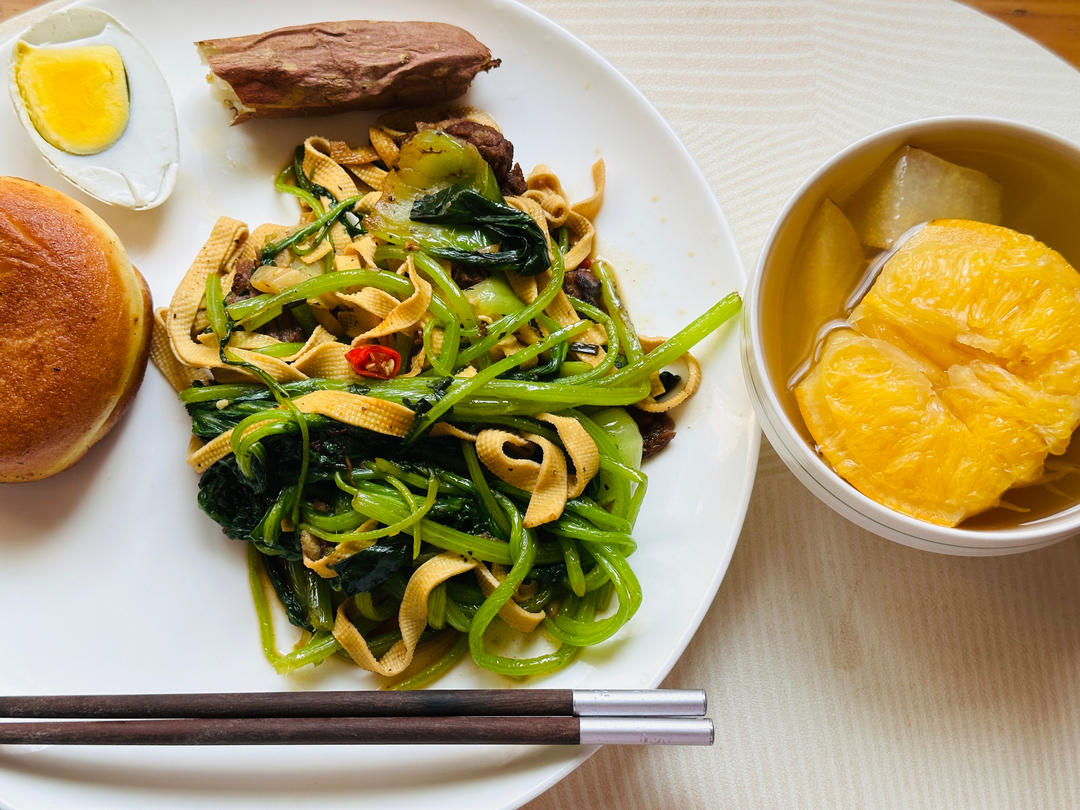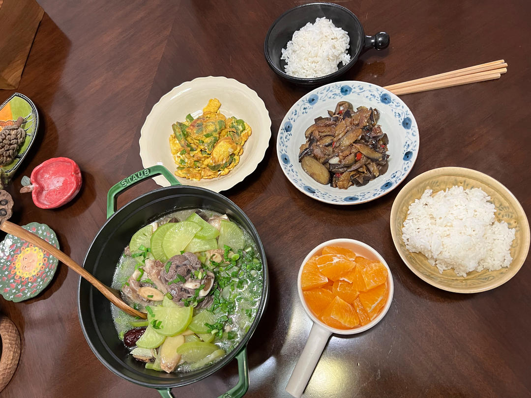 🍊🍆🥚羊肉炖萝卜、青椒煎鸡蛋、家常茄子、橙子。