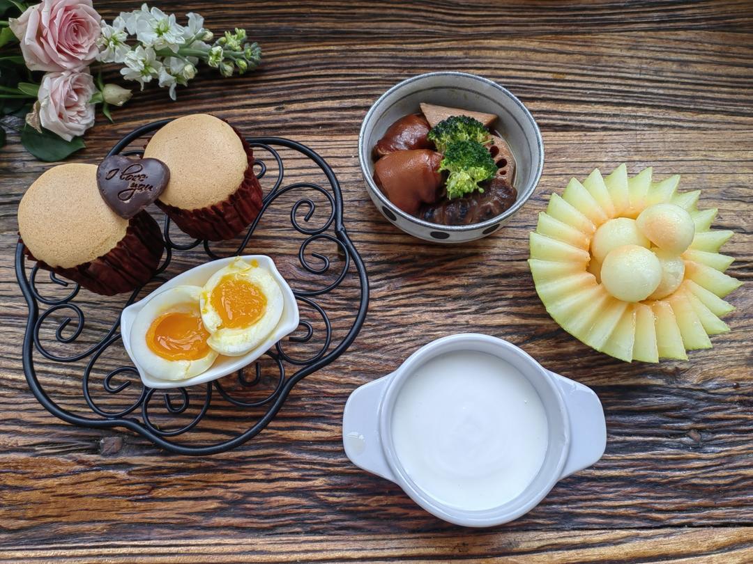 酸奶🥛+纸杯蛋糕🧁+炖猪蹄🍲+溏心蛋🥚+哈密瓜🍈