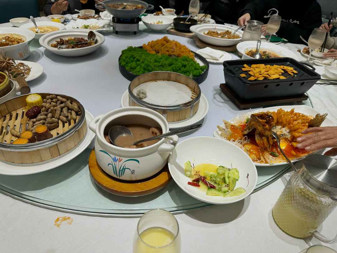 晚上送亲友们到酒店,今天很热闹一起16人。前前后后点了30多个菜,我也跟着吃撑了。。。