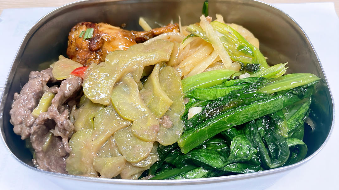 苦瓜炒牛肉,香煎鸡翅根,酸甜土豆丝,油麦菜