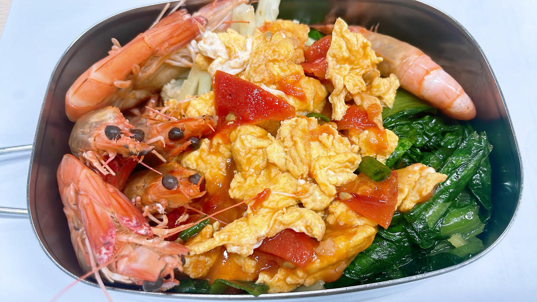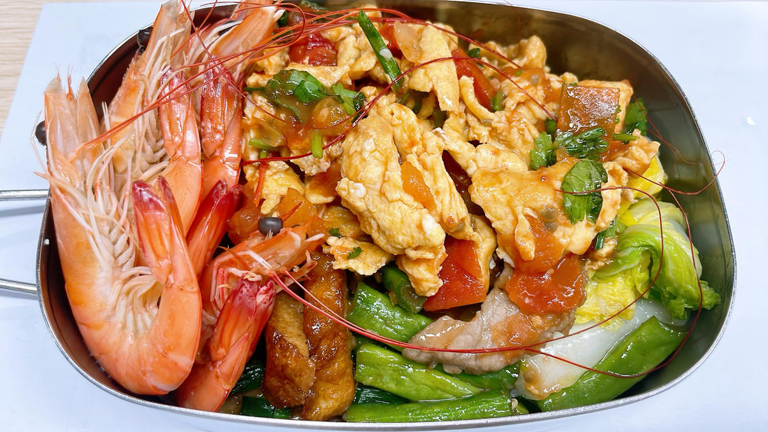 白灼虾🦐,番茄炒蛋🍅,四季豆炒肉🥩,娃娃菜