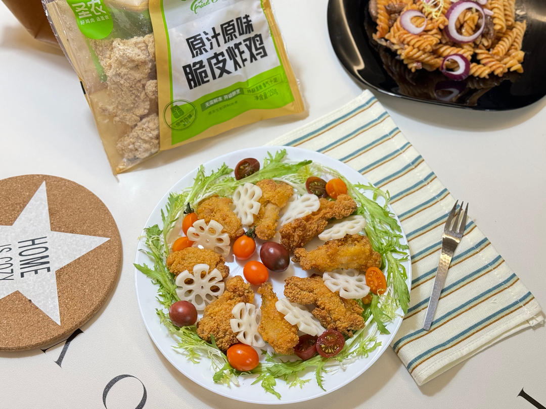 藕遇吉祥~炸鸡蔬菜拼盘,圣农脆皮炸鸡用空气炸锅烤一烤就轻松搞定,和莲藕等蔬菜拼个盘,简单又美味,寓意也吉祥,特别适合放到...