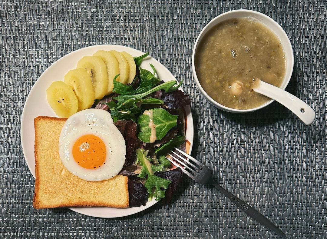 莲子绿豆汤 沙拉 kiwi 煎蛋 吐司
