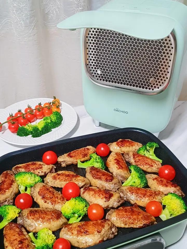 大厨新年靠你啦,大厨桌面油烟机可以直接在餐桌煎鸡翅, 前板聚拢油烟,风机吸入油烟...